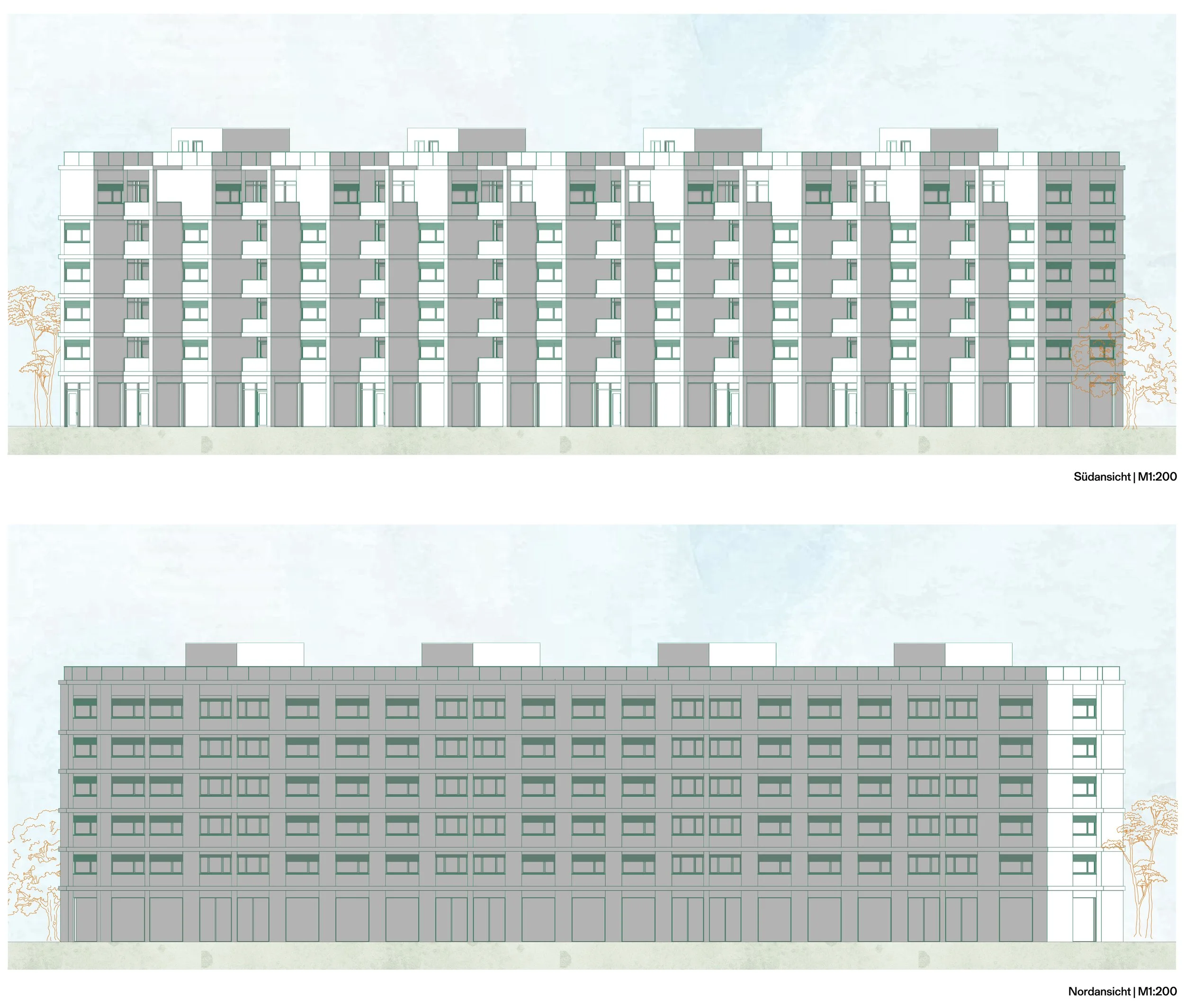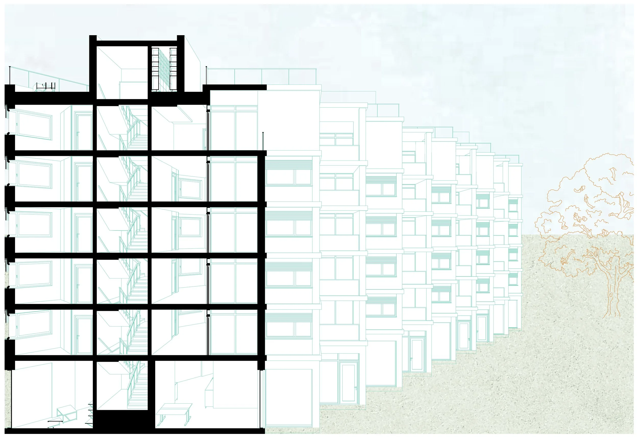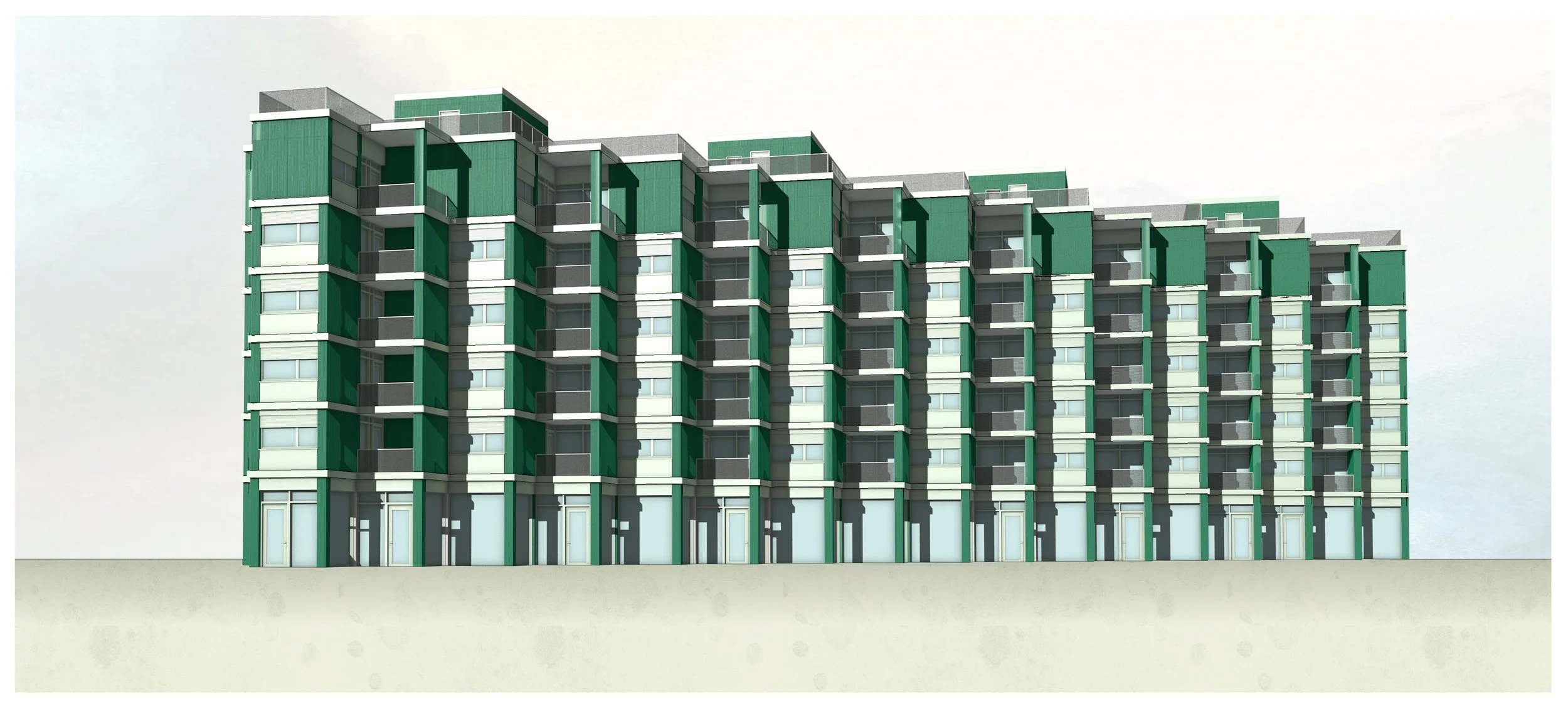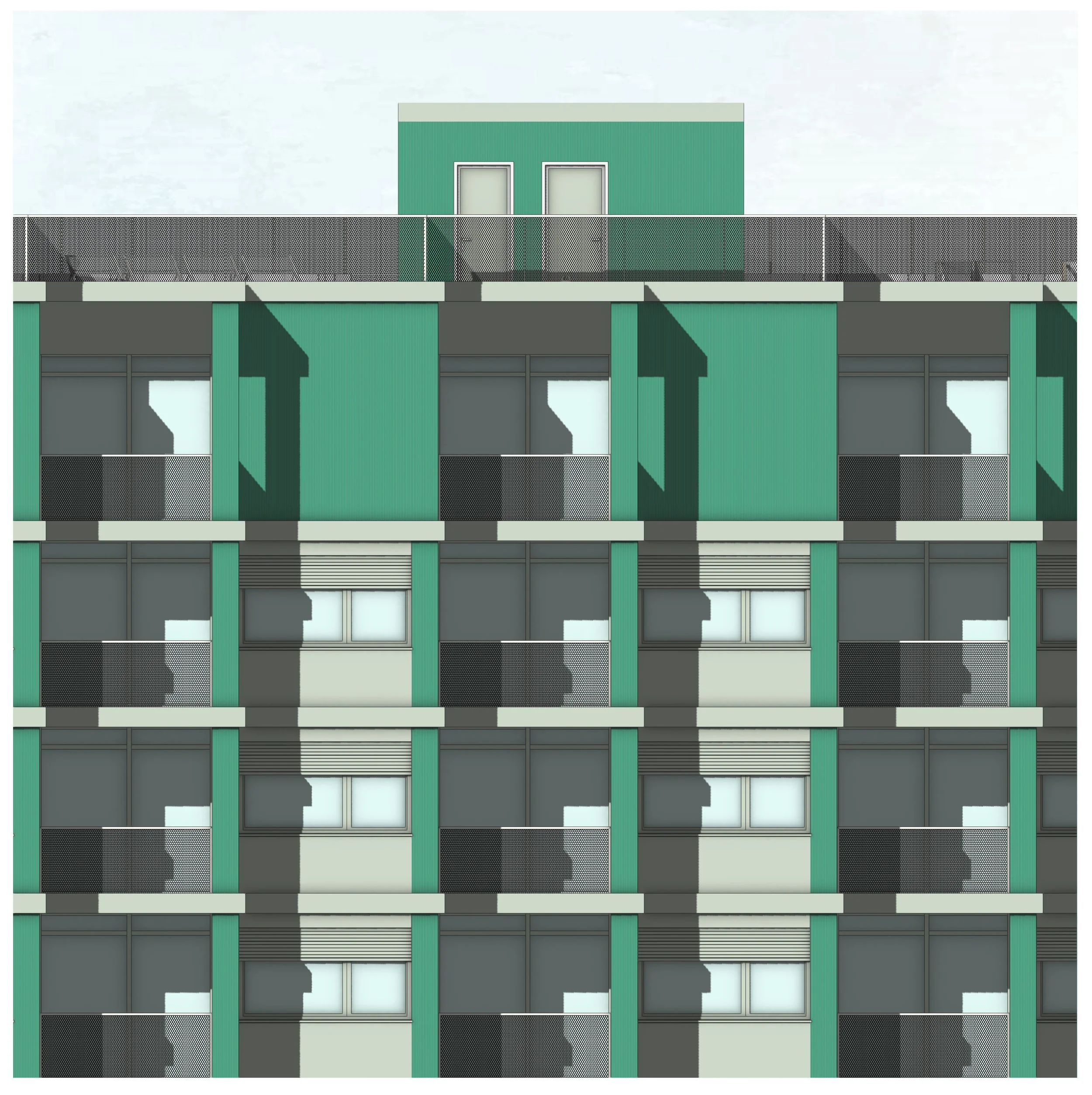 In response, our redesign aimed to improve both the aesthetic and functional aspects of the building. The first major intervention was to reposition the stairwells and elevators, moving them away from the façade and into the interior of the building. This adjustment created additional window space for the apartments, allowing for larger openings and significantly improving the quality of light and views in each unit. To ensure that the stairwells would continue to be supplied with natural light, we installed glass brick walls on the side facing the stairwells. These glass bricks allow light to pass through, but at the same time preserve the privacy of the adjacent balconies, thus creating a balance between openness and seclusion.
